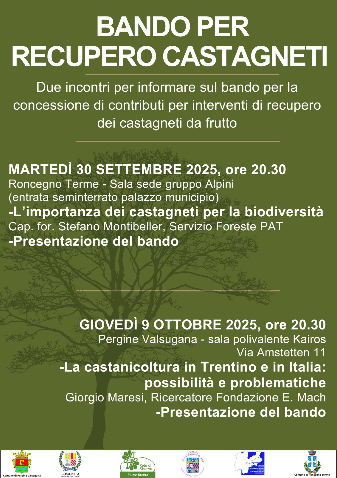 Il bando per il Recupero dei Castagneti, promosso con il supporto del Servizio Foreste PAT e della Fondazione E. Mach, è stato presentato in due incontri pubblici: il 30 settembre 2025Roncegno Terme e il 9 ottobre 2025Pergine Valsugana. Le serate hanno offerto un’occasione di approfondimento sul valore ambientale dei castagneti, sulle problematiche della castanicoltura in Trentino e sulle modalità di accesso al bando. Gli interventi di Stefano MontibellerGiorgio Maresi hanno illustrato le potenzialità di recupero e gestione sostenibile dei castagneti da frutto, con focus su biodiversità, normativa e prospettive future.