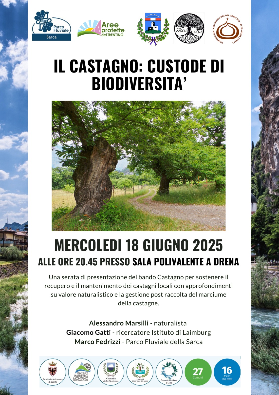 Il bando “Il Castagno: Custode di Biodiversità”, promosso da Parco Fluviale della Sarca e Aree Protette del Trentino, ha previsto un evento pubblico il 18 giugno 2025 presso la sala polifunzionale di Drèna. L’incontro ha presentato i risultati del progetto Castagno, dedicato al recupero e alla manutenzione dei castagneti locali, con interventi di naturalisti, ricercatori e tecnici ambientali. Sono stati approfonditi temi legati alla biodiversità, alla raccolta dei frutti colpiti da marciume e al ruolo ecologico del castagno nel paesaggio trentino.