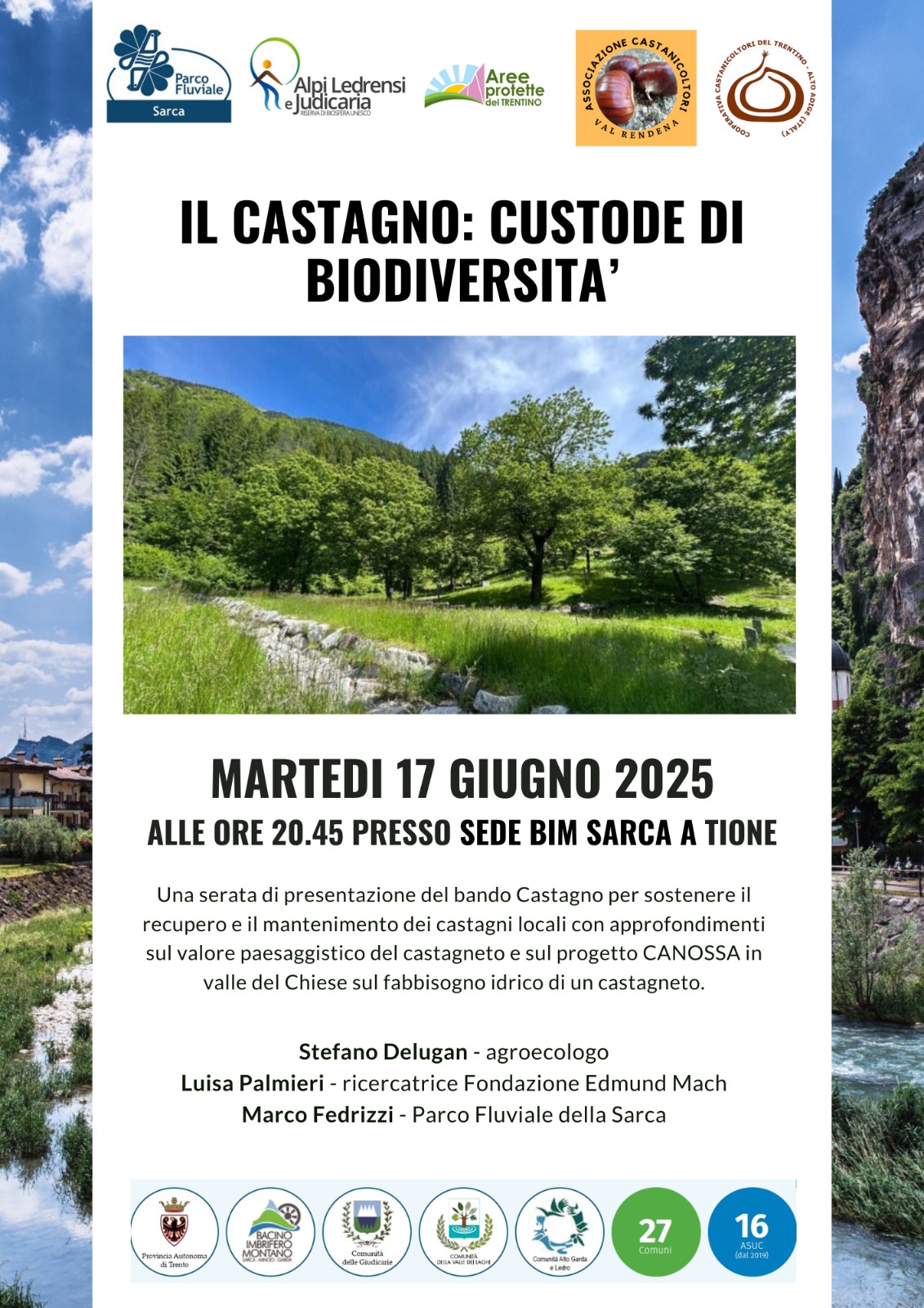 Evento dedicato alla biodiversità e alla valorizzazione dei castagneti, con esperti del settore e presentazione del progetto CANOSSA. Si è svolto il 17 giugno 2025 a Tione, presso la sede BIM Sarca.